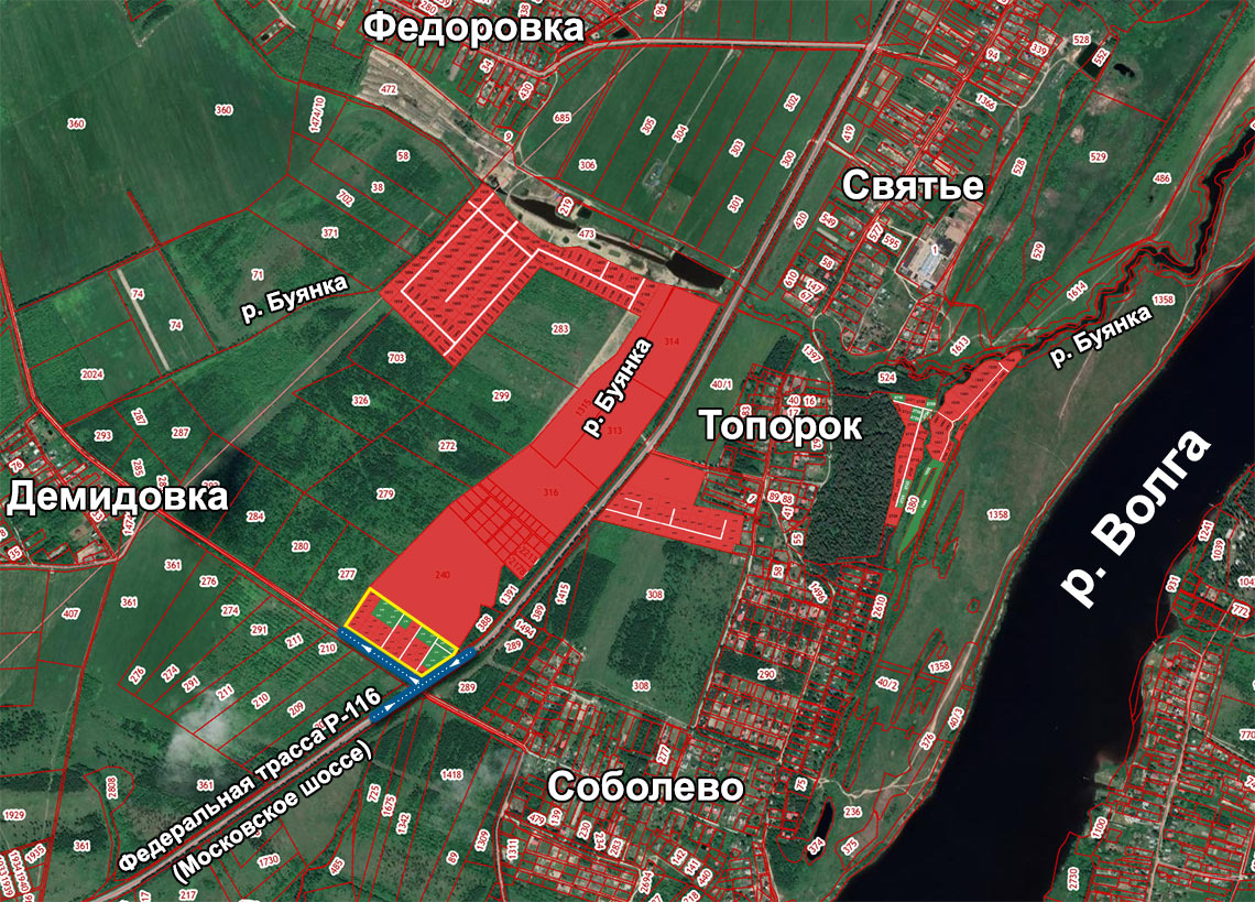 Участки в д. Соболево, д. Топорок, у воды - речка Буянка (50 м), река Волга (1000 м), бор, в 5 км от г. Дубна и в 10 км от г. Кимры.